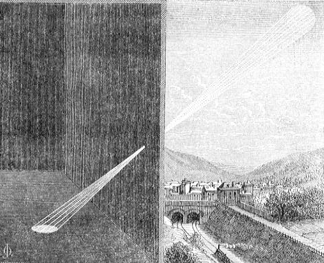 ……これを示すために、我々をして、図に示す如く、鎧戸の孔を通過し、暗黒なる室内に進入せる太陽の光線を考察せしめよう。太陽に比するならば、鎧戸の孔は点に過ぎず、かくて、其処より進入せる光線の一団は太陽を底(テイ)とする円錐を形成する。室内に進入せる、かかる光線群は、第一の円錐に相似なる、もう一つの円錐を形成するゆえ、この光線らを、孔と太陽の中心を結ぶ直線に垂直なる幕が遮るならば、像は円となるものである。もし、光線らが、傾斜せる平面により遮られるなら、像は楕円形になるのであって、小さき孔の形状を取ることは決してないのである。 |