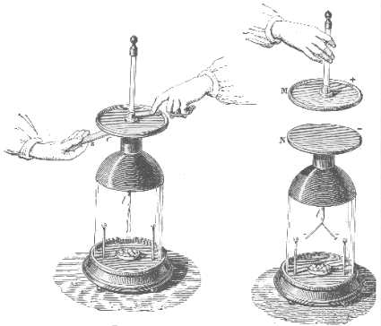 金箔検電器は、大変に敏感なものであるが、二枚の板、すなわち蓄電板を付け加えることで、さらに鋭敏にできる。